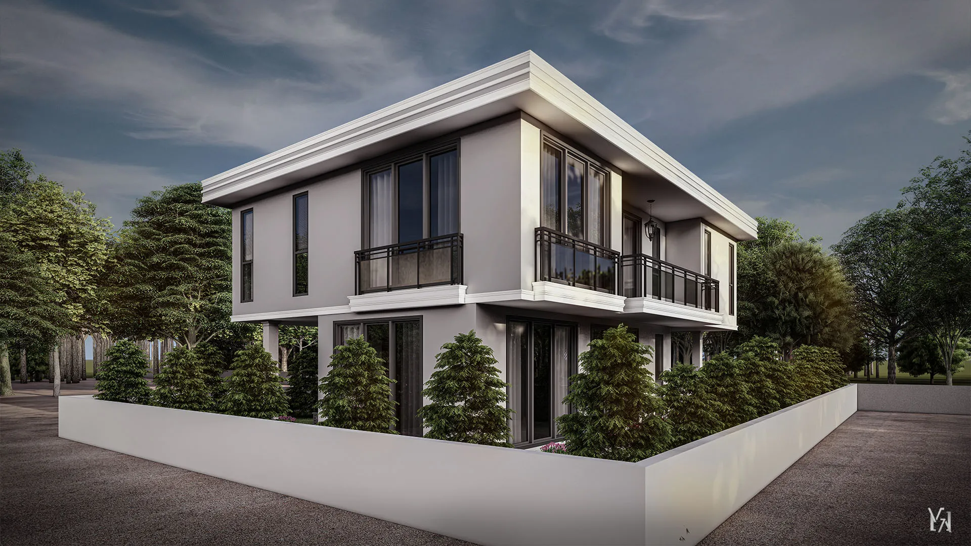 Mimaride kullanılan minimalist formlar, beyaz ve doğal tonların dengeli birlikteliğiyle sakin ve şık bir atmosfer yaratılmıştır. Bahçe peyzajı, doğayla uyumlu estetik bir yaklaşımla tasarlanmış ve günlük yaşama huzur katmayı amaçlamıştır.